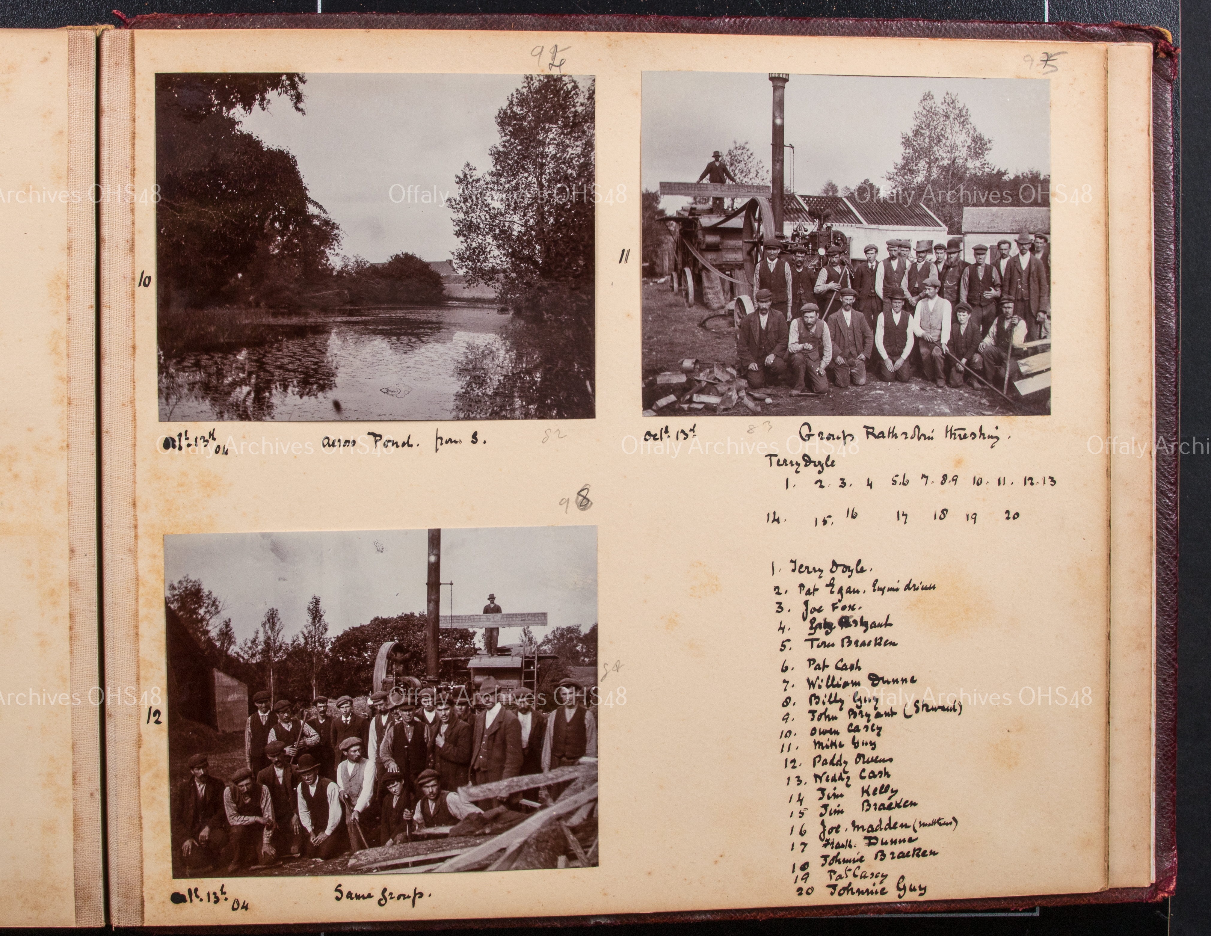 'Group Rathrobin threshing, 1. Terry Doyle, 2. Pat Egan (engine driver), 3. Joe Fox, 4. Pat Bryant, 5. Tom Bracken, 6. Pat Cash, 7. William Dunne, 8. Billy Guy, 9. John Bryant (steward), 10. Owen Casey, 11. Mike Guy, 12. Paddy Owens, 13. Neddy Cash, 14. Jim Kelly, 15. Jim Bracken, 16. Joe Maddon (Mathews ?), 17. Frank Dunne, 18. Johnnie Bracken, 19. Pat Casey, and 20. Johnnie Guy'.