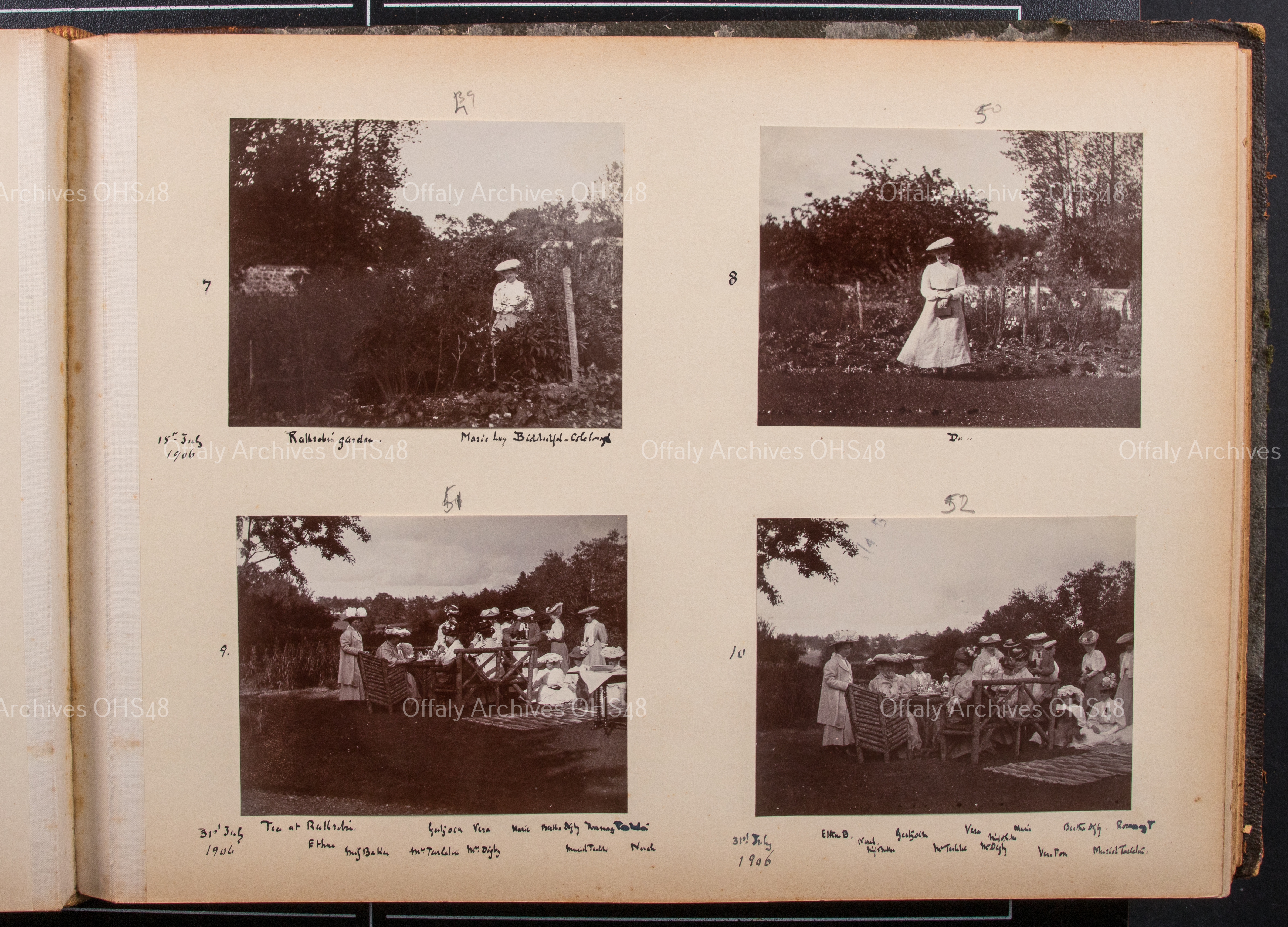 3. 'Tea at Rathrobin. Gerty OCM [O'Connor Morris] ., Vera, Marie, Berta Digby, Rosemary Tarleton, Ethne, Miss. Baker, Mrs. Tarleton, Mrs. Digby, Mariel Tarleton and Norah. 31st July 1906'.