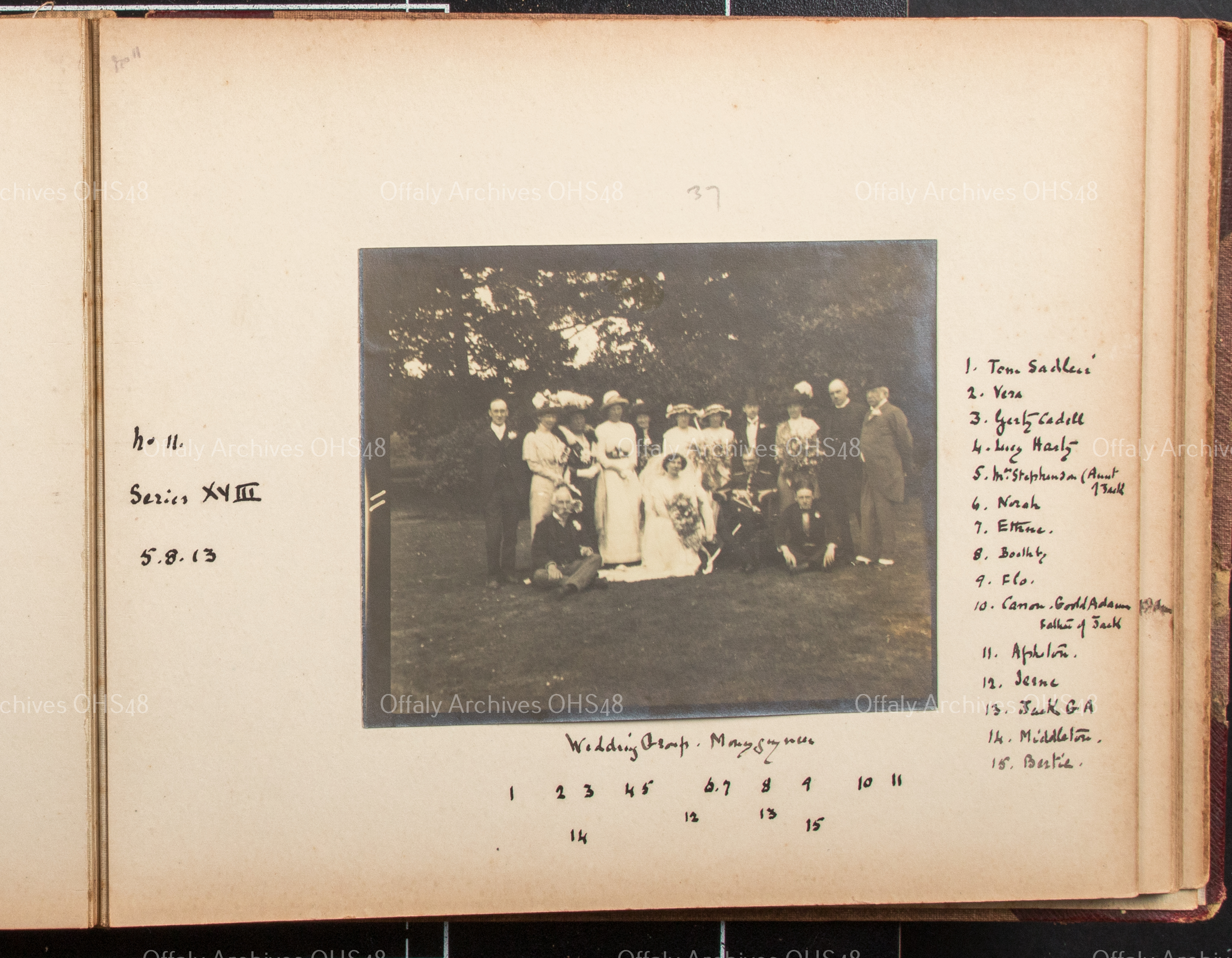 - 'Wedding group, Moneyguyneen . Tom Sadleir, Vera, Gerty Cadell, Lucy Harty, Mrs. Stephenson, Norah, Ethne, Boathy, Flo, Canon Goold Adams father of Jack, Assheton, Irene, Jack GA [Goold Adams], Middleton and Bertie'.