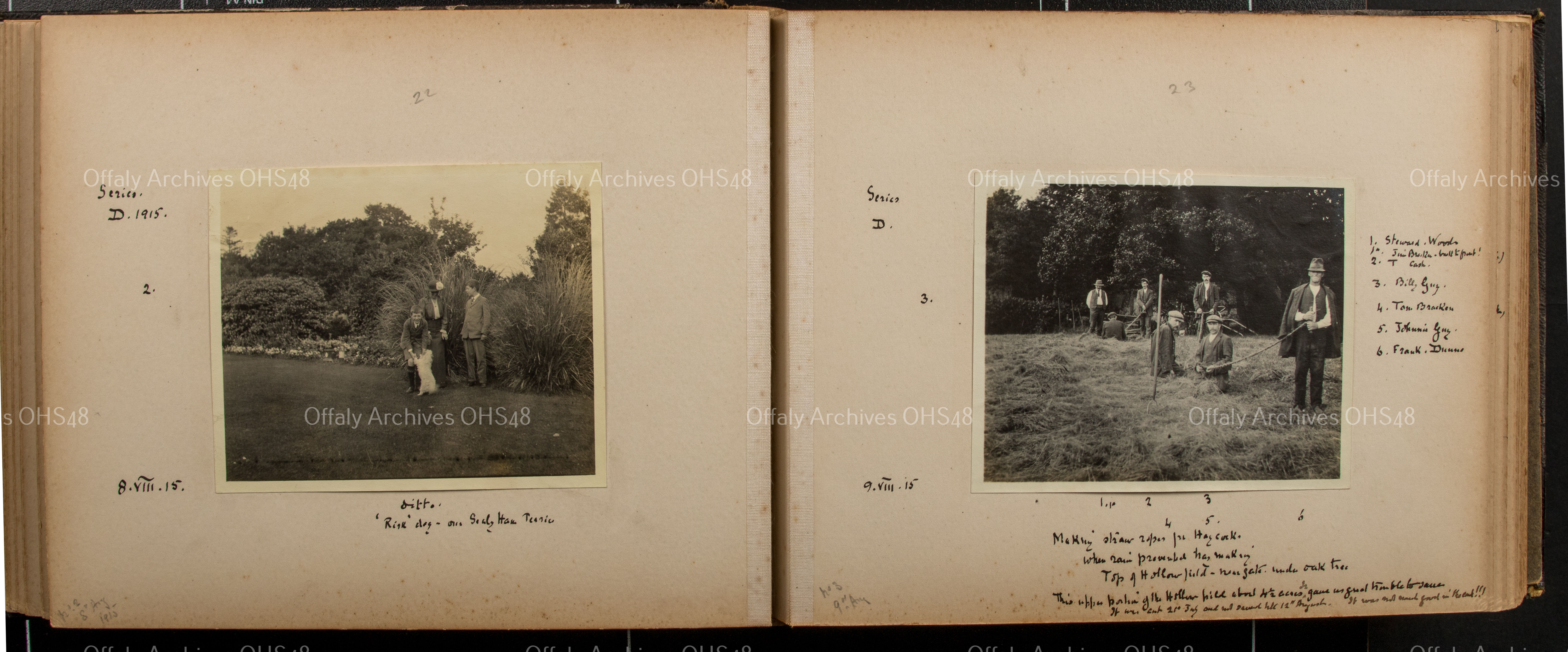 2. 'Making straw ropes for Haycock. When rain prevented hay making. Top of Hollow field - near gate under oal tree. This upper portion of the Hollow field about 4 1/2 acres gave us great trouble to dave. It was cut 21st July and not saved till 12th August. It was not much good in the cut! 1. Steward. Woods. 1a. Jim Bracken. 2. T Cash. 3. Billy Guy. 4. Tom Bracken. 5. Johnnie Guy. 6. Frank Dunne'.