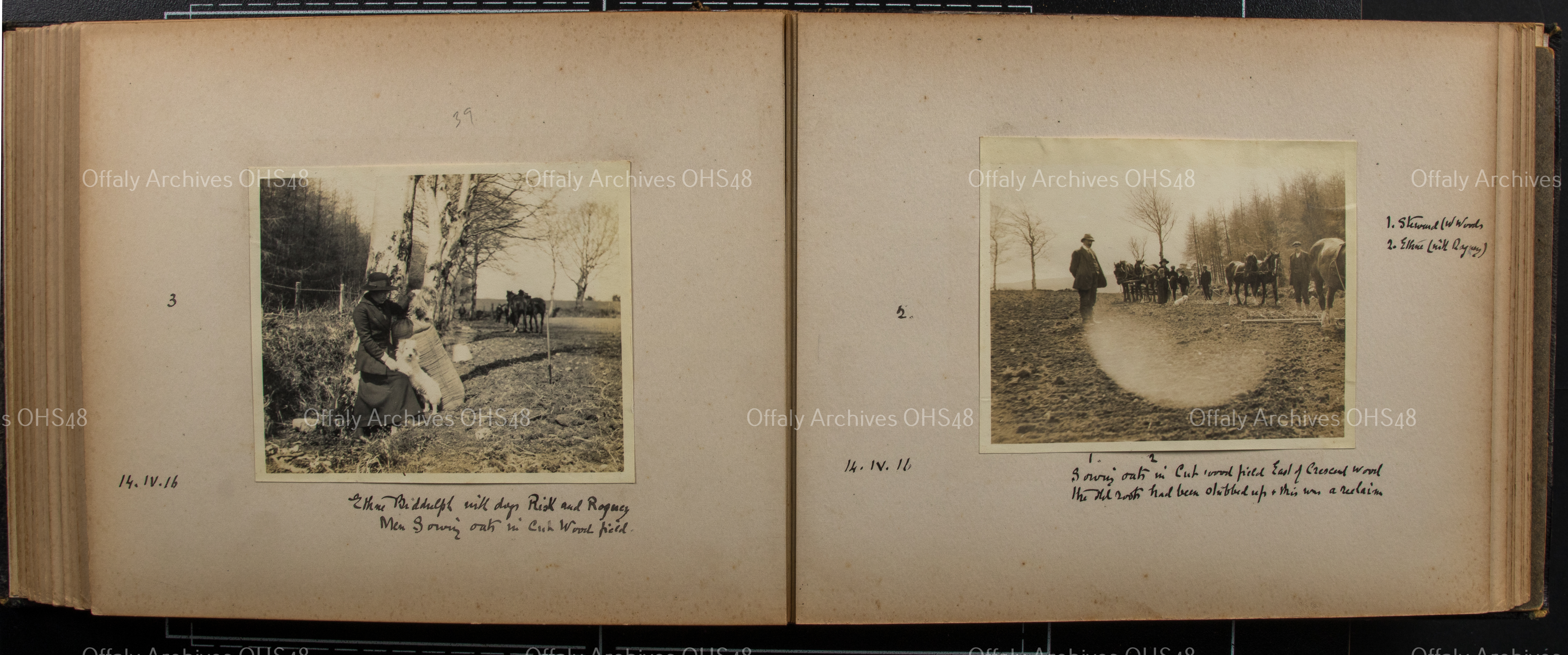 - 'Sowing oats in Cut Wood field, east of Crescent Wood, the old roots had been stubbed up and this was a reclaim. Steward (W Woods) and Ethne (with Rogney)'.