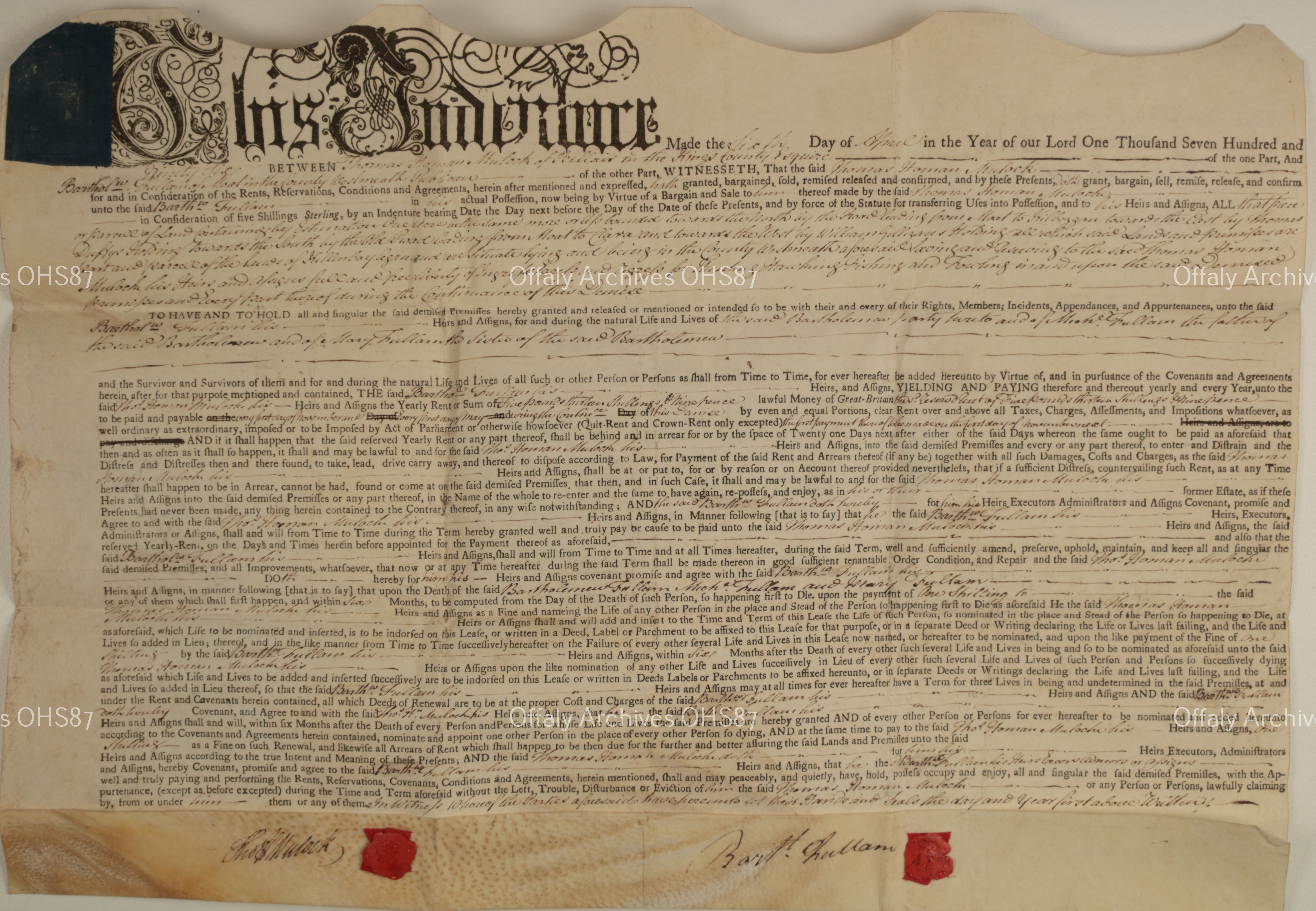 2 copies of lease for parts of lands of Killeenboylegan between Thomas Homan Mulock and Bartholomew Fullam for lives renewable forever from 1796, at the yearly rent of £5-13-9.