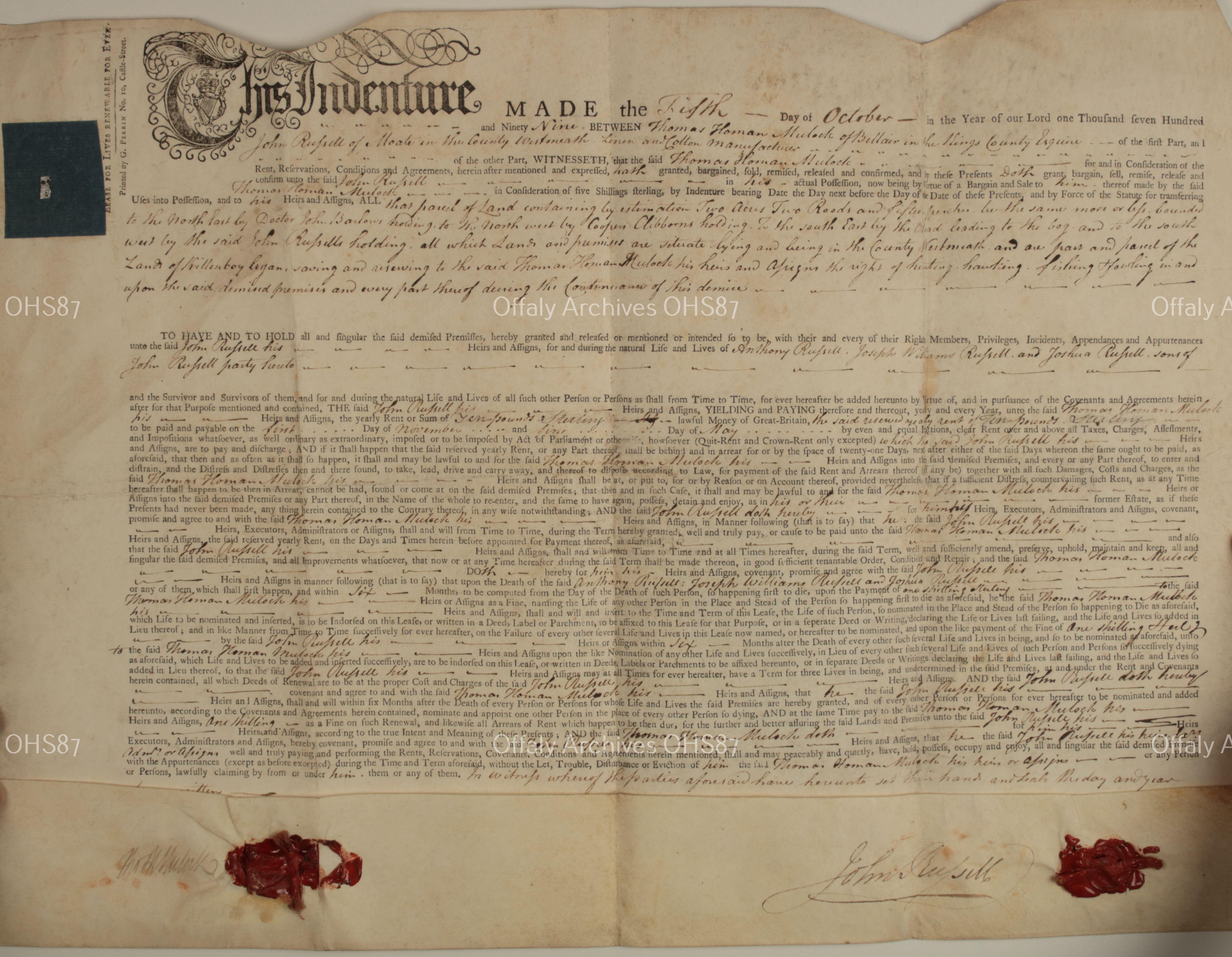 Lease for parts of lands of Killeenboylegan between Thomas Homan Mulock and John Russell for lives renewable from 1799, at the yearly rent of £57-14-6.