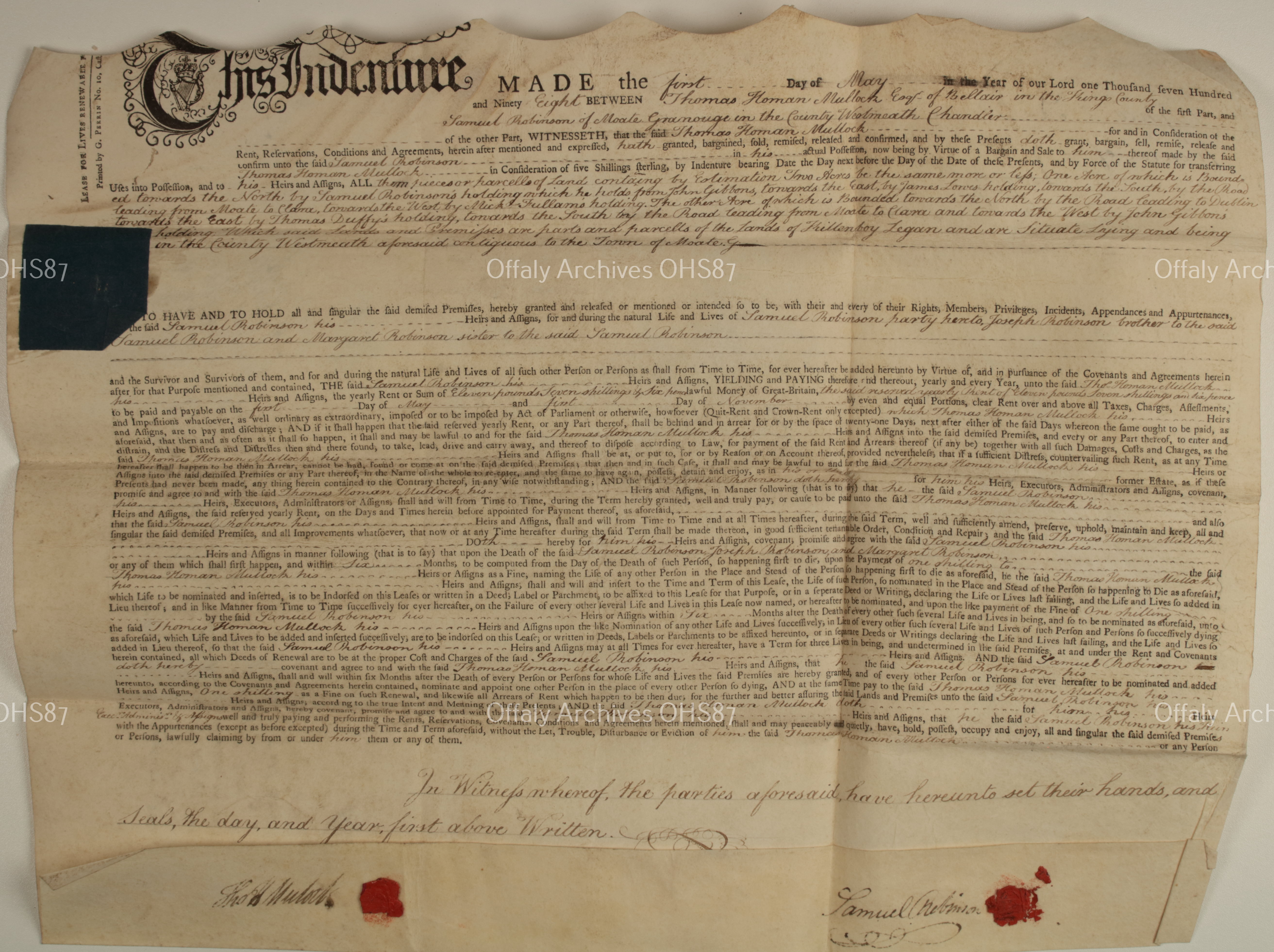 Lease for parts of lands of Killeenboylegan between Thomas Homan Mulock and Samuel Robinson for three lives from 1798, at the yearly rent of £11-7-6.