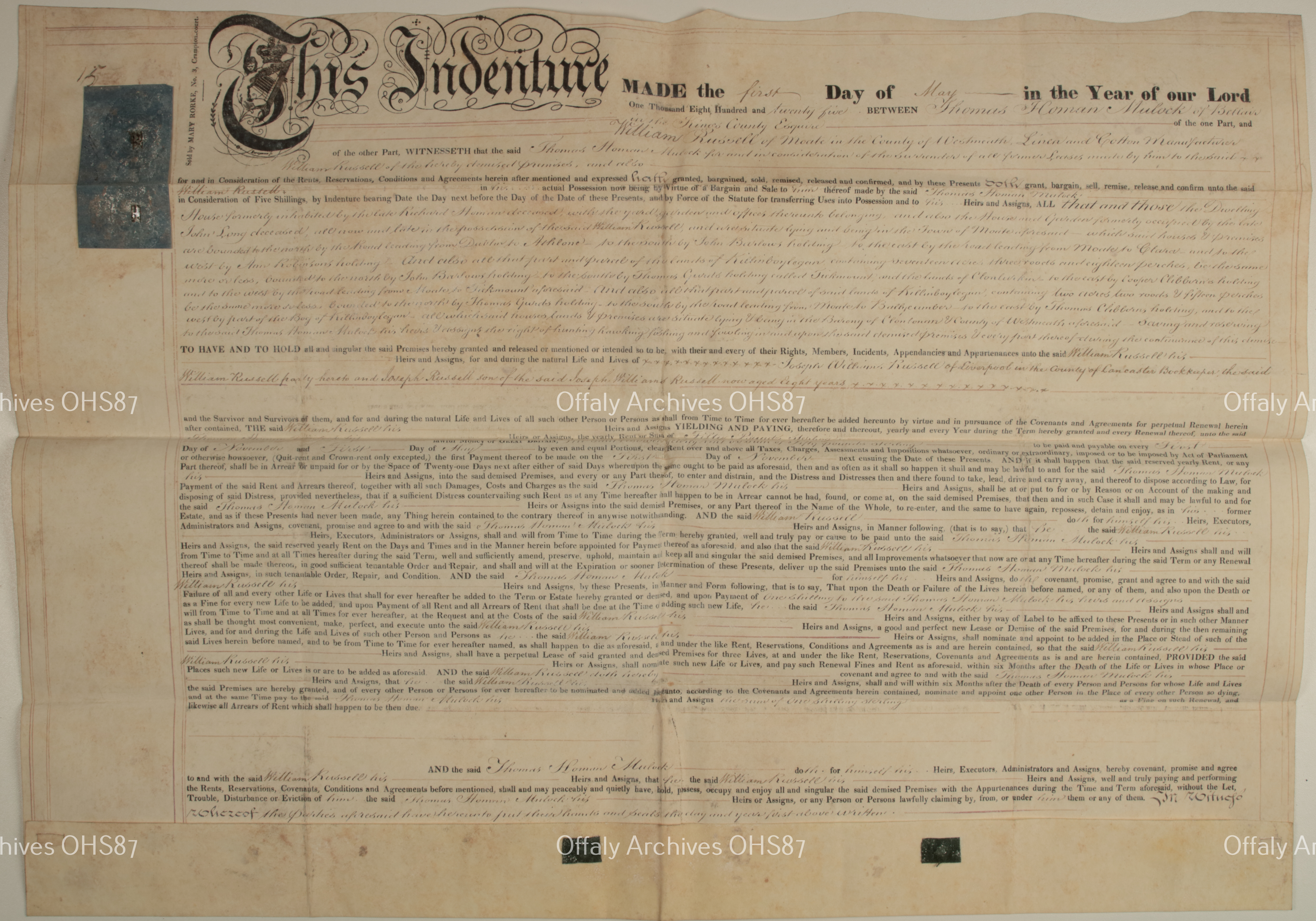 2 copies of lease and memorial of lease made 1825 between Thomas Homan Mulock and William Russell for dwelling house and garden in the town of Moate, formerly inhabited by the late Richard Homan.