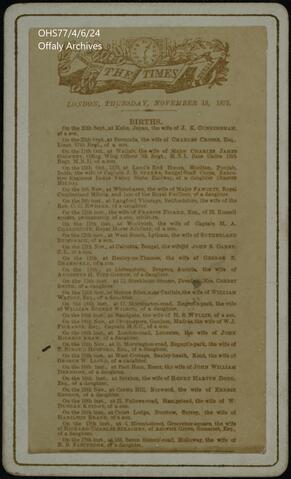 Photograph of the birth announcements in The Times, London, from 18 November 1875, announcing the birth of a daughter to T Stroud Hosford on 15th Nov 1875 at 35 Mornington Road, Regents Park, London.